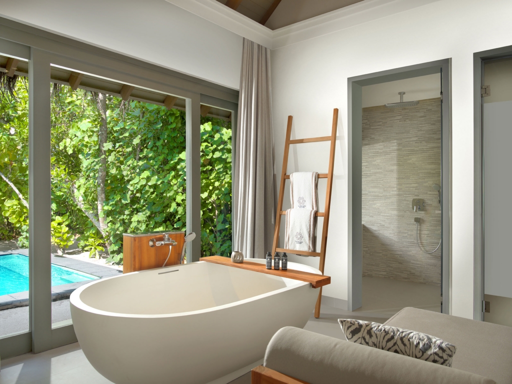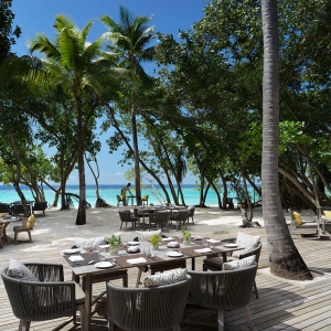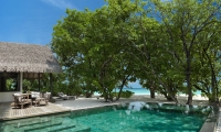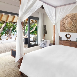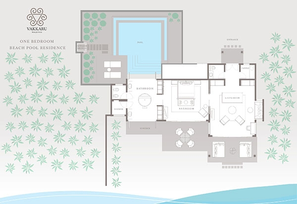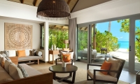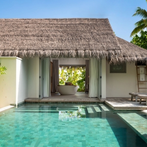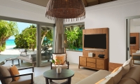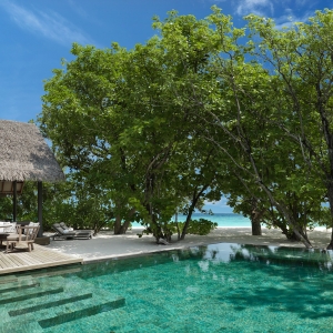 The epitome of luxury beach hideaway, One Bedroom Deluxe Beach Pool Residence offers a serene space amidst lush tropical gardens. Featuring the same authentic interior design characteristics of our guest villas, this luxurious residence has been enhanced even further with a separate living room, spacious beachfront terrace, a private pool and bathroom all facing the azure waters of the lagoon.