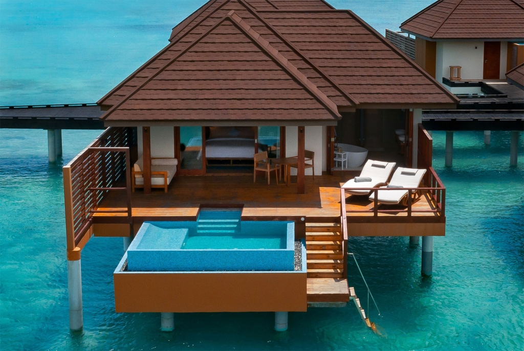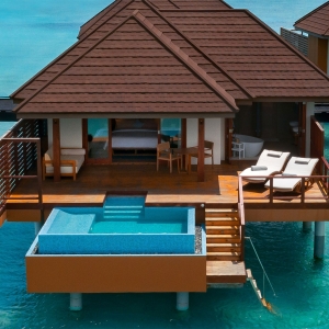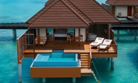 Breathe eloquence in your aquatic paradise with endless ocean vistas from every window and the touch of turquoise waters a step away. Located at the end of a wooden jetty this exclusive water suite offers uninterrupted sunset views and absolute privacy for a truly romantic lagoon stay. Curl up on the comfortable rattan sun loungers or sink into the inviting sofa on your private veranda, with the turquoise and azure waters stretching as far as the eyes can see. Step into the lagoon for some snorkelling adventures. Swim under the stars in your private 10-square-meter infinity pool.