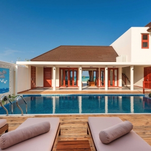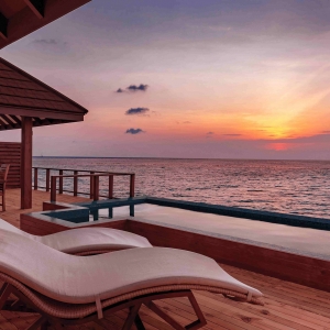 Step out to an expansive veranda leading to a sandy beach, and experience walking on a cloud. Furnished with two inviting loungers, a large sofa, a side table and two chairs, the veranda comes with the option of a 10-square-meter private plunge pool. End your day in this private paradise with a glass of relaxing wine on the open deck as you enjoy a multicoloured Maldivian sunset.