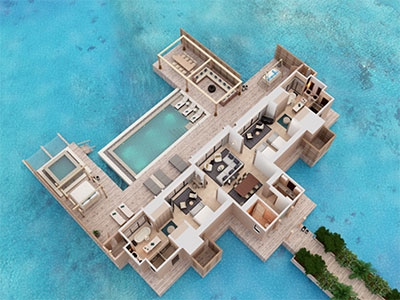 This spacious retreat offers an intimate getaway with indoor and outdoor living areas. Featuring a BBQ station, direct ocean access, and a private infinity pool with overwater hammocks. Exclusively accessed by boat.